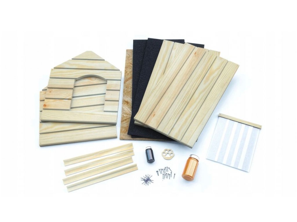 Die Hundehütten werden aufgeklappt geliefert. Sie erhalten die Hüttenwände zusammen mit einem Montagesatz mit Schrauben, einer Anleitung mit detaillierten Anweisungen und 250 ml Holzschutzmittel. Die Hundehütte ist nicht lackiert, sie muss also mit der mitgelieferten Farbe imprägniert werden.