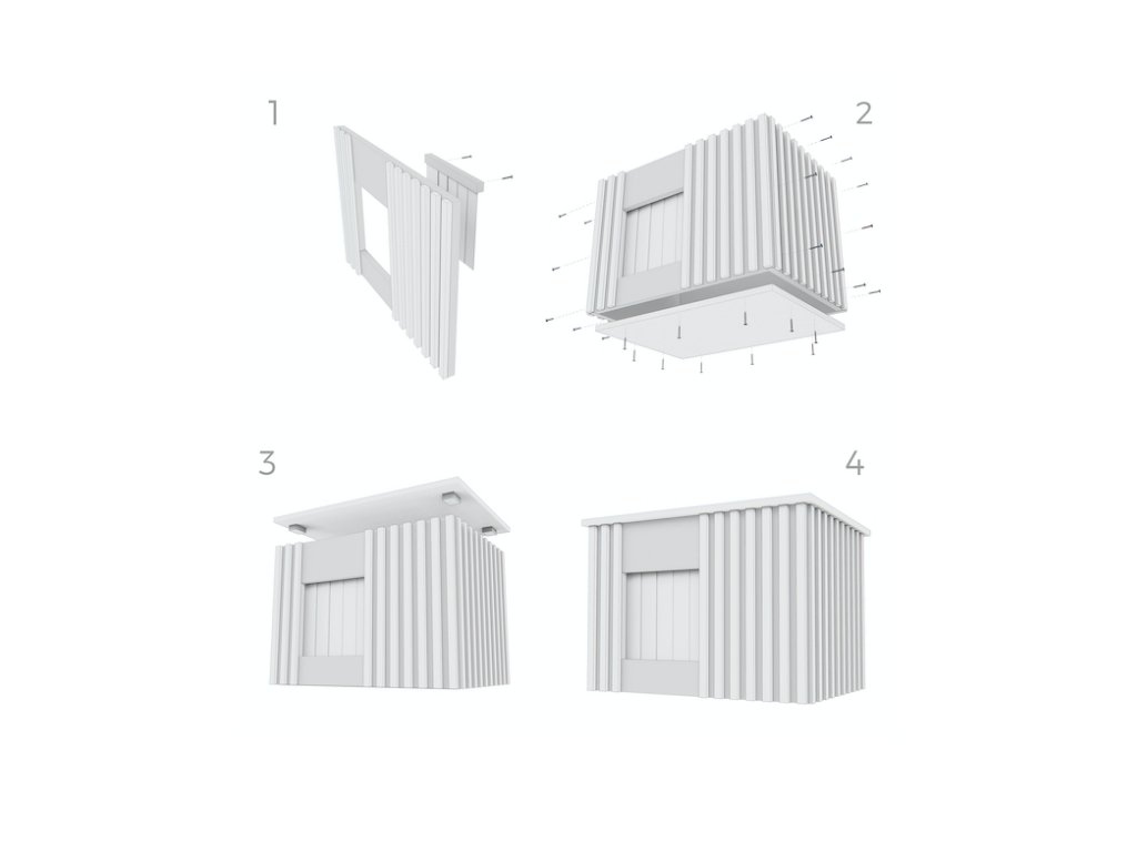 Die Lofts werden aufgeklappt geliefert. Sie erhalten die Hüttenwände zusammen mit einem Montagesatz, bestehend aus Schrauben und einer Anleitung mit detaillierten Anweisungen. Die Hundehütte ist mit Graphitfarbe gestrichen. Wir empfehlen, die Lofts zusätzlich mit einem farblosen Lack zu streichen.